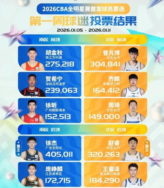 CBA全明星投票白热化:徐杰票王,郭艾伦暂排第4,庞峥麟徐昕登榜