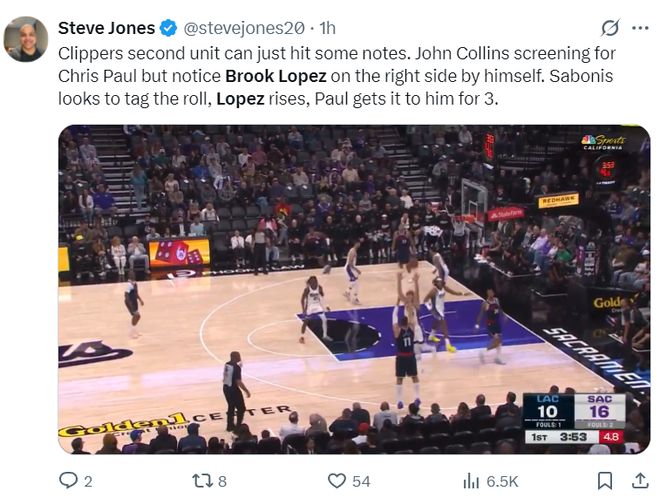 快船记者史蒂夫-琼斯写道:快船的第二阵容表现很不错,科林斯为保罗掩护,大洛去右侧蹲着拉开空间,等小萨去协防保罗后,保罗甩出来给大洛三分命中。