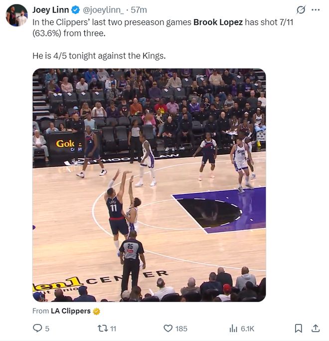 快船记者Joey Linn写道:大洛最近这两场季前赛,三分球11中7,三分命中率高达63.6%。