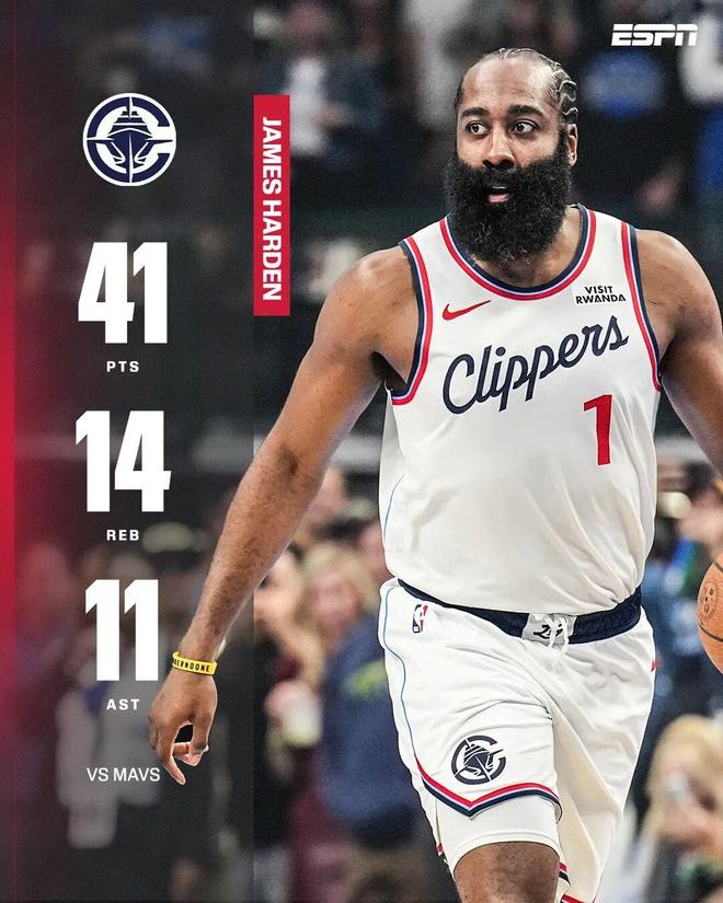 常规赛,快船客场133-127战胜独行侠。这场比赛,哈登打出了赛季至今最强的一场比赛:全场出战51分钟,投篮25中13,三分12中6,罚球11中9,得到41分14篮板11助攻,另外还有2盖帽1抢断。大概
