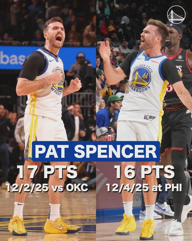 后场无人可用的情况下,勇士将双向球员斯潘塞调入首发阵容,这是后者NBA生涯至今第一次首发出战。