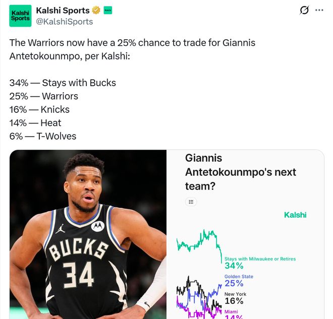 在预测机构Kalshi Sports给出的字母哥下家名单中,勇士队也以25%的可能性高居第二,仅次于留守雄鹿队的34%,要比尼克斯16%、热火14%和森林狼6%高出不少。