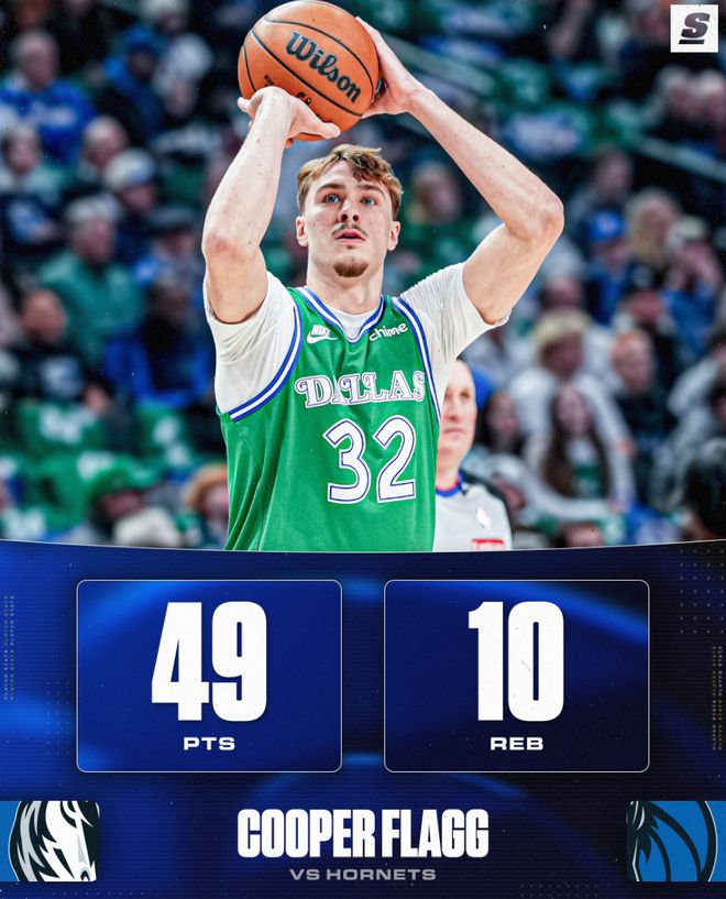 库珀-弗拉格在对阵黄蜂一战中狂揽49分10篮板3助攻1盖帽(29中20+三分5中3),他杜克蓝魔时期的队友(室友)克努佩尔三分12中8也狂砍34分,这两位天之骄子的比拼非常之精彩,但最耀眼的还是状元郎弗拉格,因为他这场比赛创造了太多、太多的纪录。