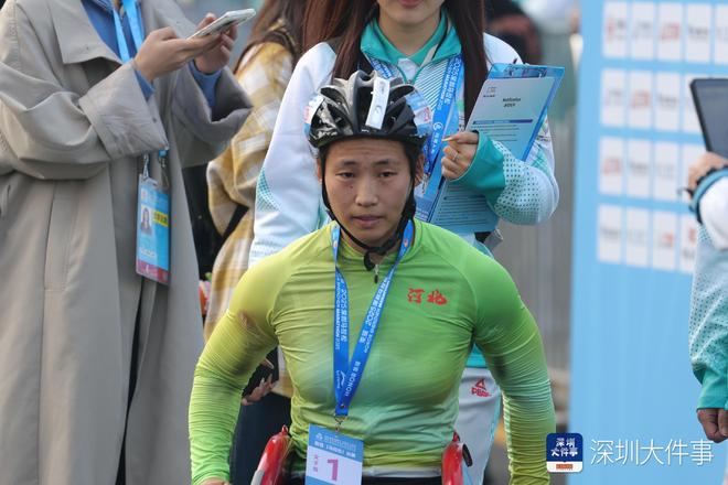 随后抵达终点的女子组T54级别的比赛上演了集团冲刺的精彩对决。河北名将周召倩以1小时46分24秒的成绩摘得桂冠。广东选手陈晓纯以1小时46分26秒获得亚军,河北选手周洪转以1小时46分27秒位列第三,前三名之间时间差仅有3秒。广东选手陈晓纯在赛后接受南都N视频记者采访时表示,自己在赛前也是对几位对手做了一定的了解,在比赛最后的阶段都竞争得比较激烈,因为最后一个弯道比较急,并且过弯之后就是终点冲线,降速之后很难再提高的最高速度。虽然以2秒的微弱差距获得亚军稍显遗憾,但还是很开心的,对于天气状况的快速适应是这一次主场作战的主要优势,并且今天的天气条件也很适宜比赛。此外,陈晓纯还提到,在这一次比赛中,现场细心的志愿服务给了她十分深刻的印象,赛前赛后经过每个坡道的时候都有志愿者帮忙推车拿装备。