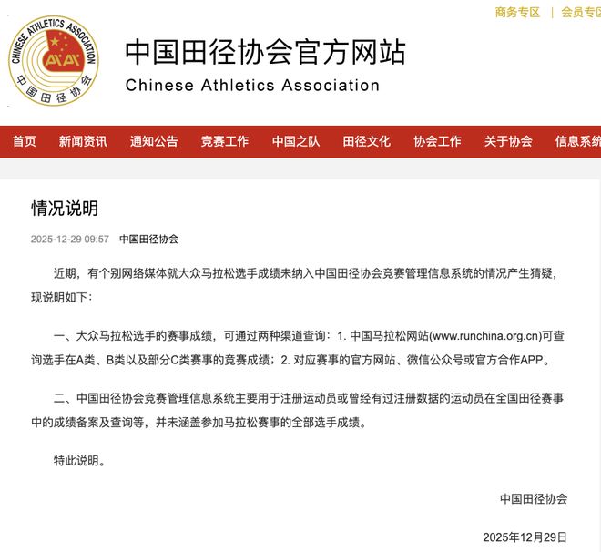 12月29日,中国田径协会发布情况说明,全文如下:近期,有个别网络媒体就大众马拉松选手成绩未纳入中国田径协会竞赛管理信息系统的情况产生猜疑,现说明如下:一、大众马拉松选手的赛事