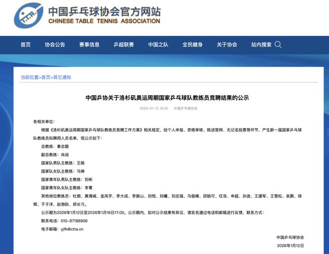 2025年12月20日,中国乒乓球协会曾在官网发布《中国乒乓球协会关于举行洛杉矶奥运周期国家乒乓球队教练员竞聘的通知》,正式启动新周期国家队教练员公开竞聘工作,完成洛杉矶奥运周期备战任务。