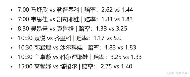 从当前博彩公司对中国七将开出的赔率来看,只有吴易昺和袁悦最被看好;韦思佳和郭涵煜被则是有希望获胜;其他人想晋级,至少从赔率而言,可能都得有比对手更上佳的发挥才行。(来源:网球之家 作者:月亮河的星空)
