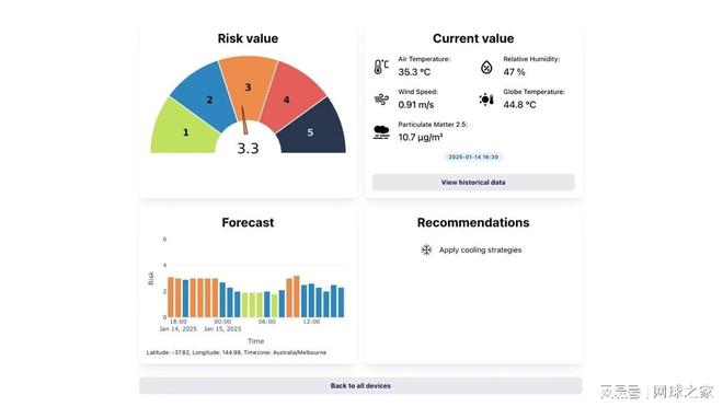 澳网将上述搜集的数据,通过算法计算得出一个1-5级的分量级表,再将级数实时显示在仪表盘上,这套系统还可以对未来几个小时的级数进行预报。