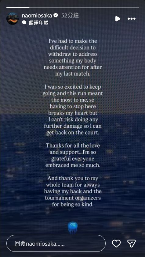 大坂直美宣布因左腹部受伤退出与英格利斯的第三轮比赛。以下是声明全文: