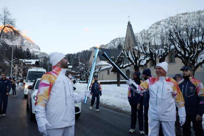 1月26日,科尔蒂纳丹佩佐的冬奥火炬传递活动中,两名火炬手正在交接圣火。(法新社)