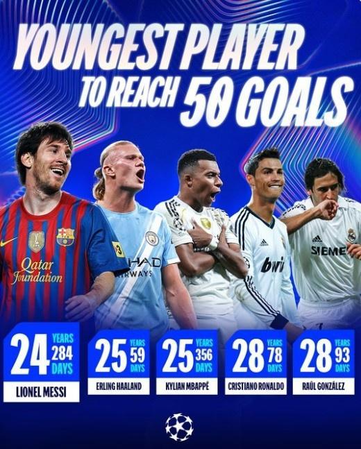 9月26日讯 对阵那不勒斯的欧冠联赛阶段比赛,哈兰德打进1球成功解锁欧冠50球里程碑。但是,哈兰德并不是欧冠历史打进50球最年轻球员,阿根廷传奇梅西保持着这一纪录。以下为欧冠
