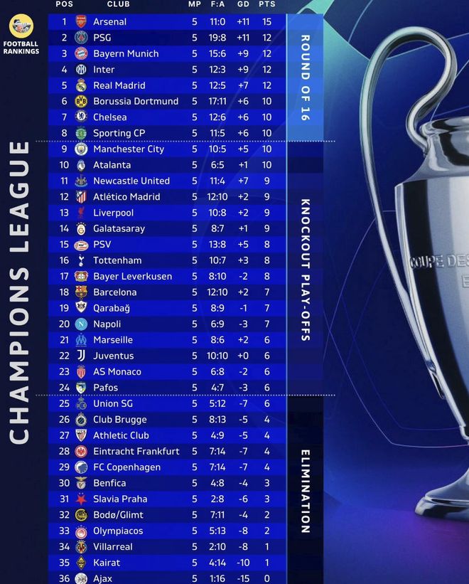 31!欧冠榜首易主:拜仁跌至第3!大巴黎旧将5场9球,领跑射手榜