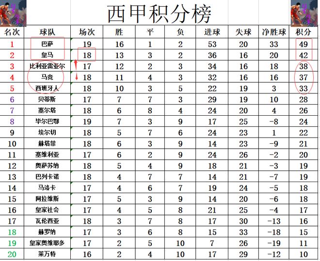 西甲最新积分战报巴萨多皇马7分夺半程冠军黄潜超马竞升至第3
