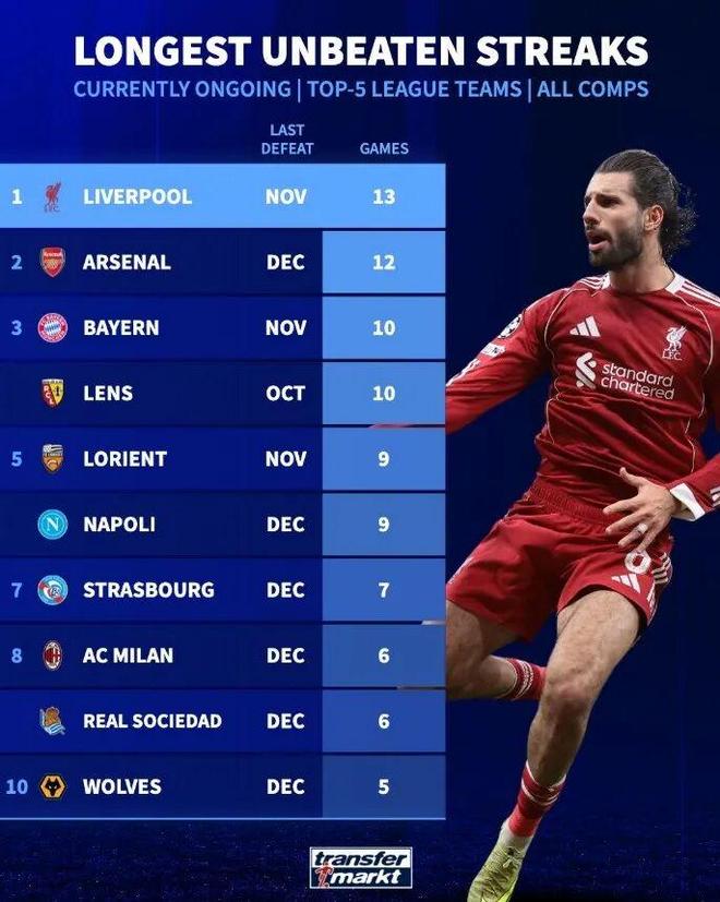 米兰圈德转盘点了目前五大联赛球队各项赛事现存最长不败场次榜,具体如下:1、利物浦 13场2、阿森纳 12场3、拜仁、朗斯 10场5、洛里昂、那不勒斯 9场7、斯特拉斯堡 7场8、AC米