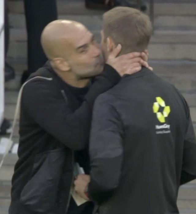 9月22日讯 阿森纳vs曼城第90分钟,瓜迪奥拉场边和裁判交流,还亲了一口裁判的脸颊!