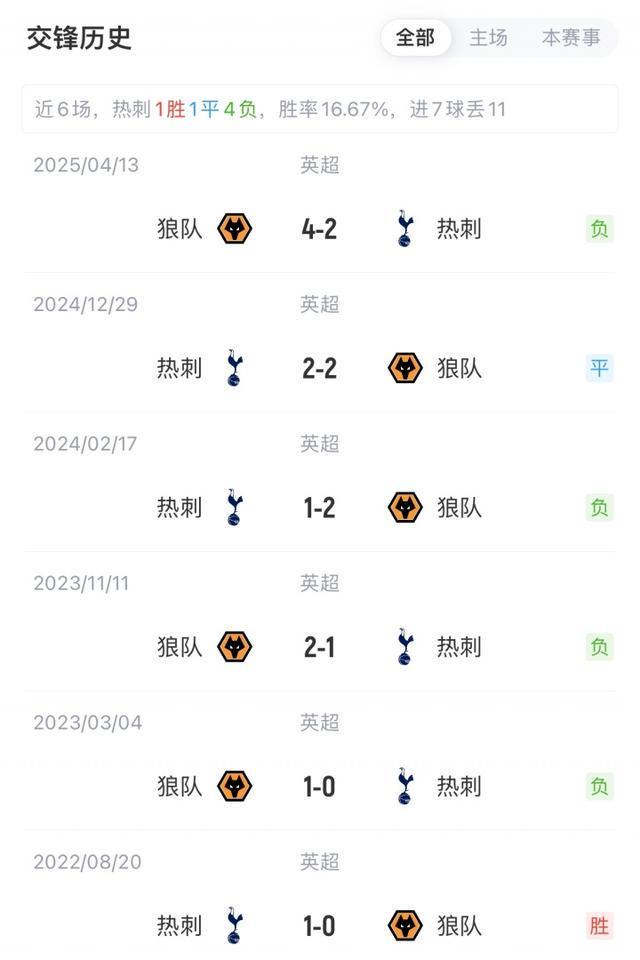 积分榜方面,热刺3胜1平1负积10分,近4场不败;狼队开季5轮连败目前垫底。历史交锋热刺对阵狼队近5场不胜(1平4负)。