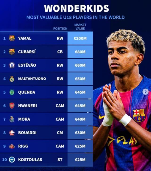 《转会市场》统计了当前世界足坛U18球员身价情况,亚马尔无悬念2亿欧独自领跑。德转列U18身价榜:欧元