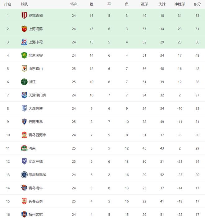 成都蓉城、上海海港、上海申花、北京国安稳居积分榜前四,本轮联赛四队捉对厮杀,将在本周日晚上进行。此外,长春亚泰、梅州客家、青岛海牛的保级形势最为严峻,两个降级名额大概率将在以上三队产生。