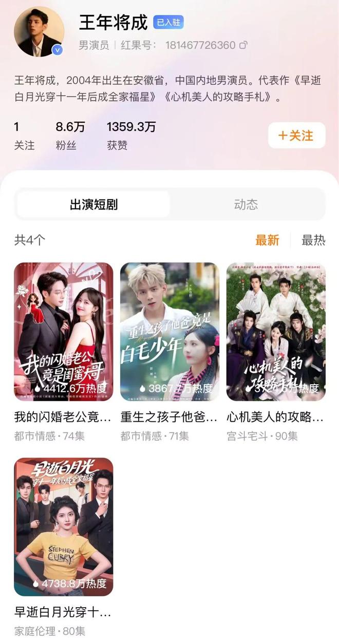 近期,前中超门将王年将成投身短剧赛道的消息引发不少人关注,极目新闻记者注意到,出生于2004年的这位前中超门将,如今已在红果短剧平台拥有4部热门剧集。