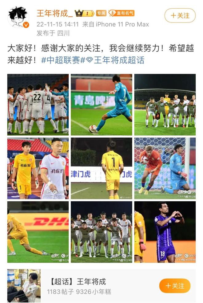 其实在担任门将期间,王年将成就因为184cm的身高和颇具青春感的面孔收获了一群粉丝,极目新闻记者关注到,其微博目前能看到的最早消息发布于2022年11月15日他登陆中超赛场后不久,彼时他便有一些粉丝的关注。