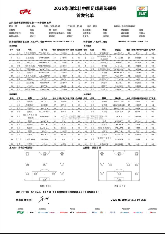 北京时间10月19日19:35,中超联赛第27轮,河南主场迎战长春亚泰,赛前双方公布首发阵容: