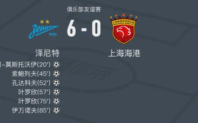 而稍晚时候结束的海港队与俄超劲旅泽尼特的比赛,海港队遭遇一场溃败。